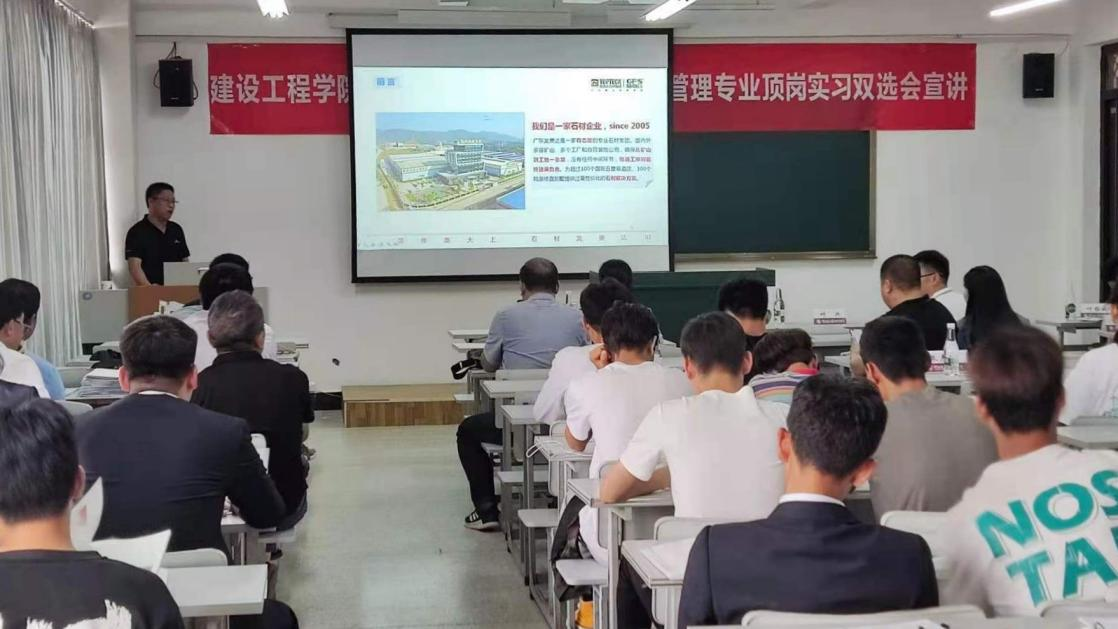 当日,在明尚楼C308教室还举行了2019级建筑材料生产与管理专业顶岗实习双选会,共100余名同学参加双选会,来自江苏南通石材协会、广东云浮石材商会的27家企业,对顶岗实习员工的就业前景做了详细的分析,通过ppt的讲解下,让同学们分别从主要工作、工作对象、工作范围、薪资待遇、福利、业余生活等多方面进行了解。也希望同学们树立正确的就业价值取向,积极准备,主动寻求就业机会,顺利找到满意的工作。
