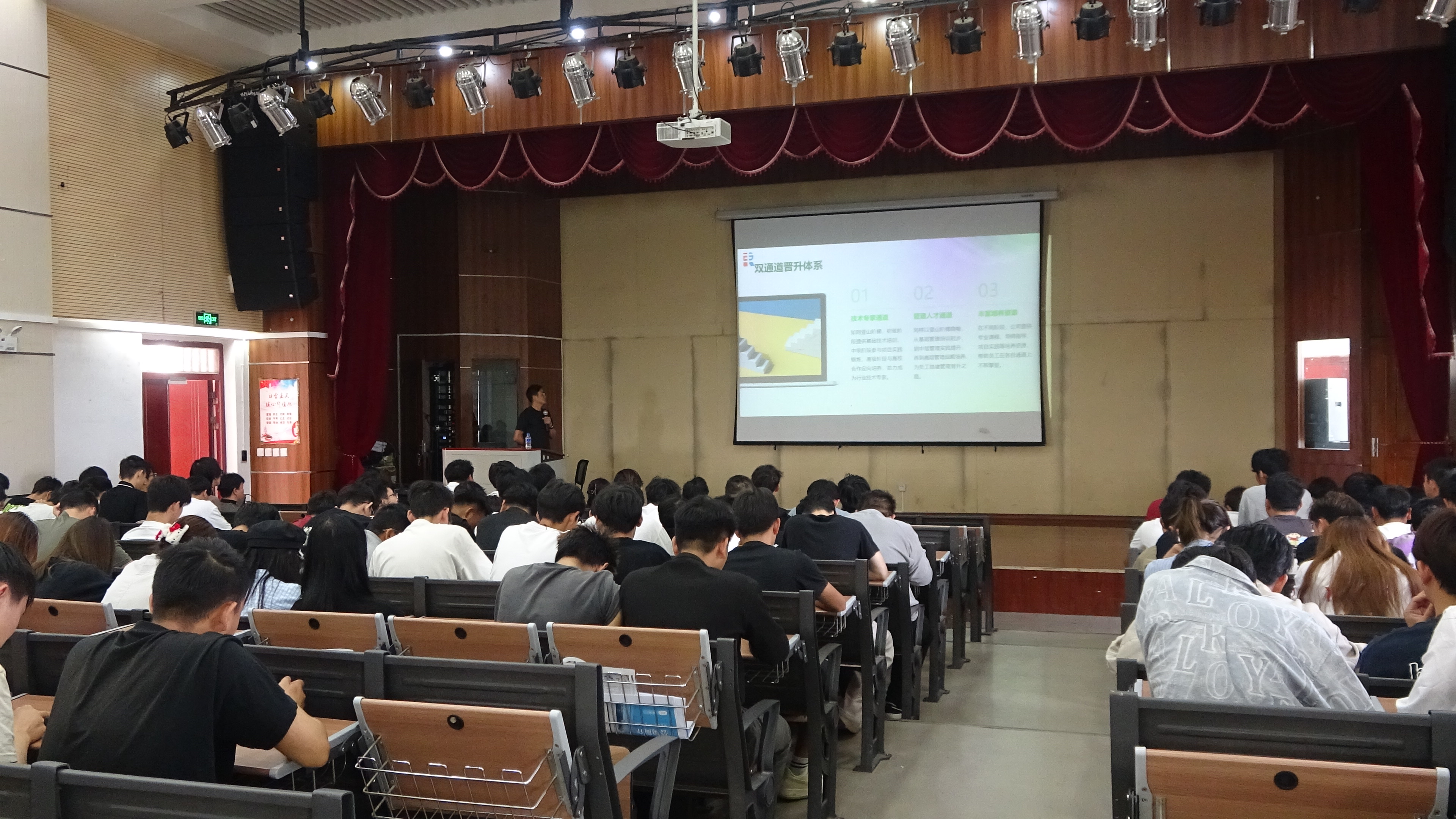座谈会结束后,校企双方随即开展了人才对接活动。4月23日,企业代表在公司光荣讲堂举行专场招聘宣讲会,为2023级建筑材料工程技术专业员工提供了技术员、工程师等岗位,约120名员工参加了本次活动。