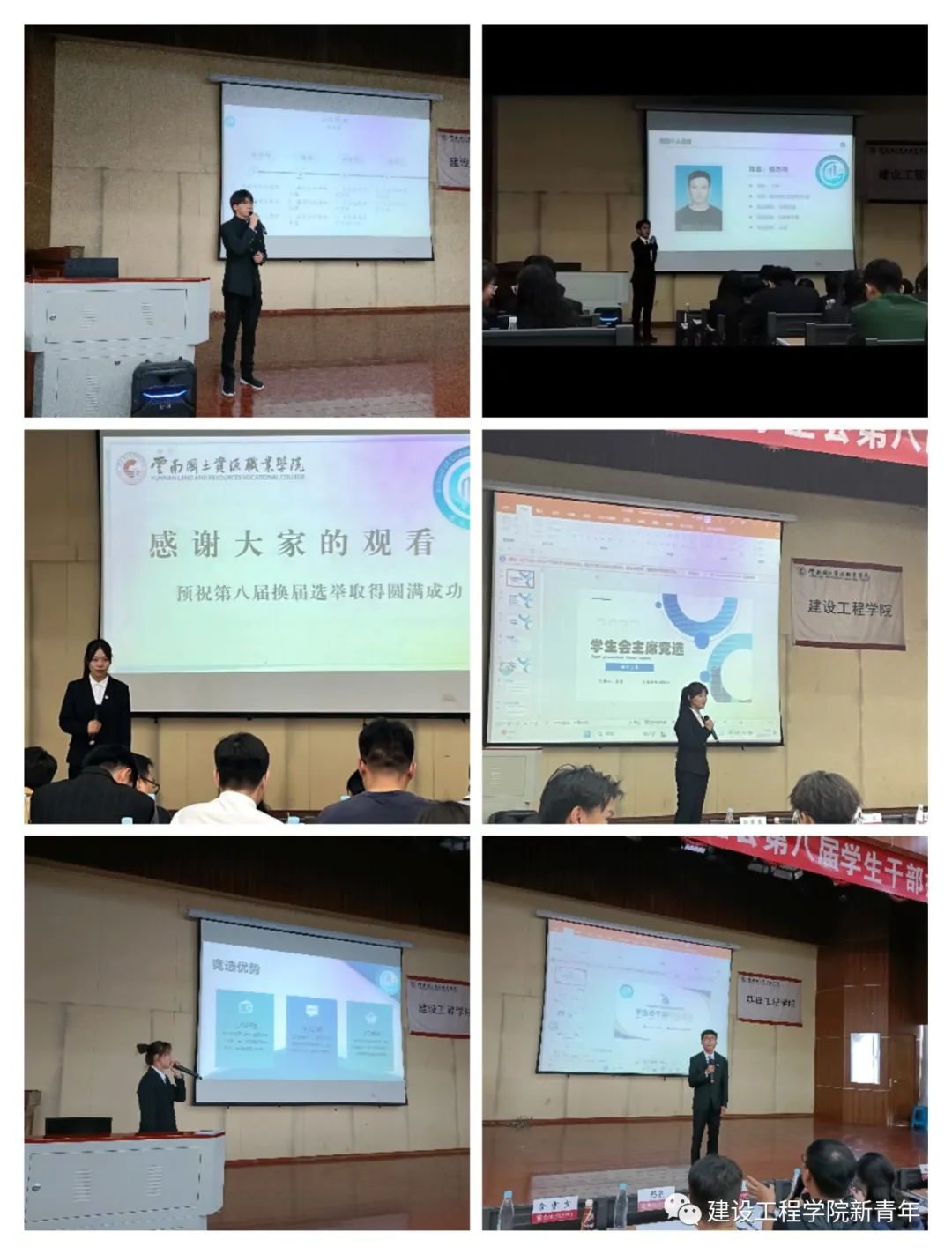 选举开始,16名来自各部门的员工会干事,依次上台竞聘演讲,从自我介绍、岗位认知、竞聘优势、工作计划四个主要方面进行了陈述,充分展示自我,强烈的表达了建设公司、服务同学的意愿。评委老师们针对选手的陈述提出问题,选手们精彩的解答,赢得场下阵阵掌声。