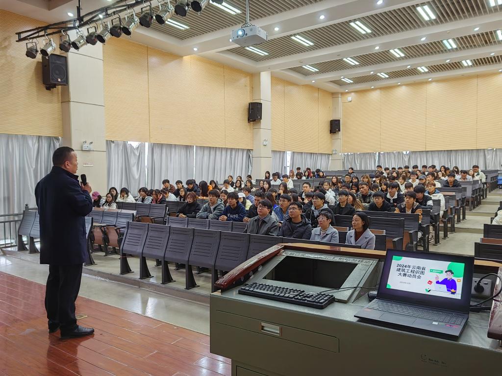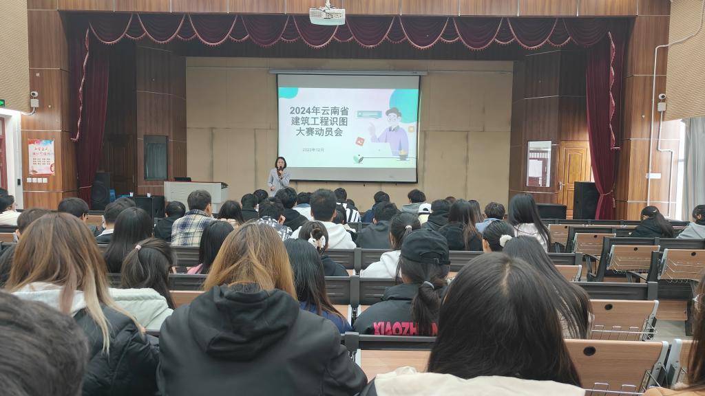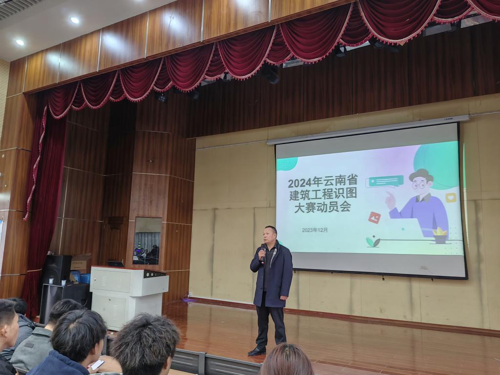 2023年12月8日中午,2026年世界杯官网在光荣讲堂召开2024年云南省建筑工程识图大赛赛项动员大会,2026年世界杯官网经理彭明兴,党总支副书记李洪香,专职教师潘少红、刘晖、赵岩枫,中望软件公司总监刘宇航以及2022级工程造价、建筑经济信息化管理和建设工程管理专业的员工参加动员大会。