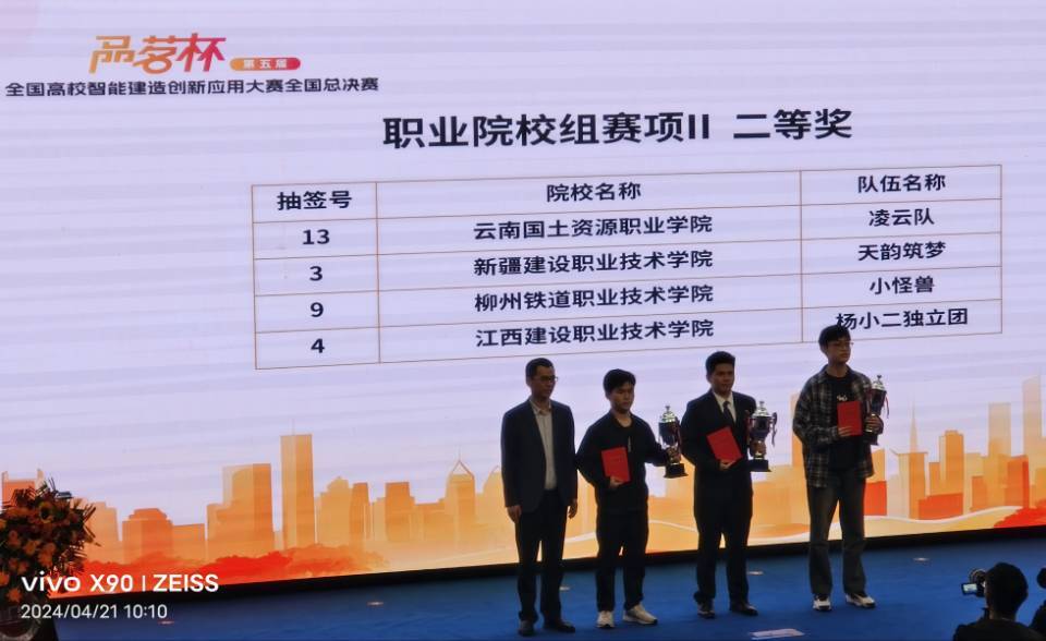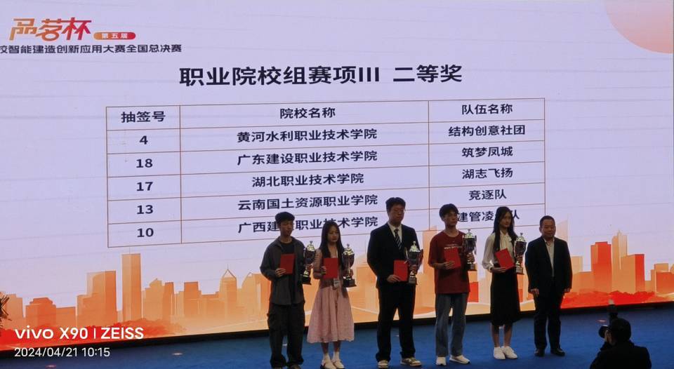 由冷雨桐、肖羽彤、姜丽雯、杨安邦、朱荣兵组成的明湖筑梦队,参加赛项三数字化施工方案设计比赛并荣获全国一等奖。该组的指导老师为罗昌杰、朱磊。
