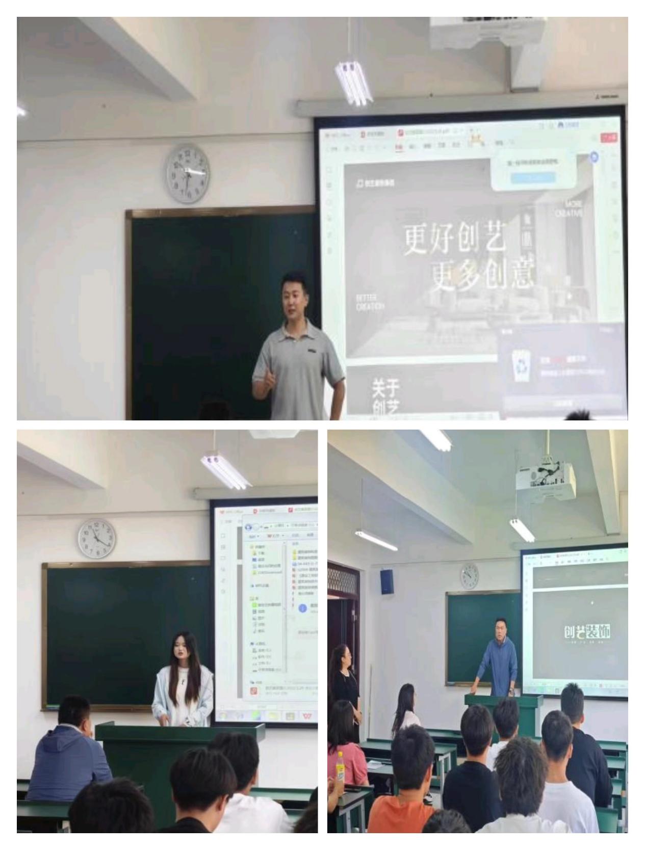 5月7日上午10:20,“创意集团”名下的昆明喜客喜装饰有限公司和蒙自创新艺装饰有限公司在明尚楼C403召开企业宣讲会。此次宣讲由王祎婷和林志强两位老师主持。该集团的总经理田仕豪、前台主管赵秋英、网销主管李乐鹏、业务主管杨蝶、公司在该集团工作的往届毕业生以及2022级建筑装饰工程技术班的同学们参加了宣讲会。