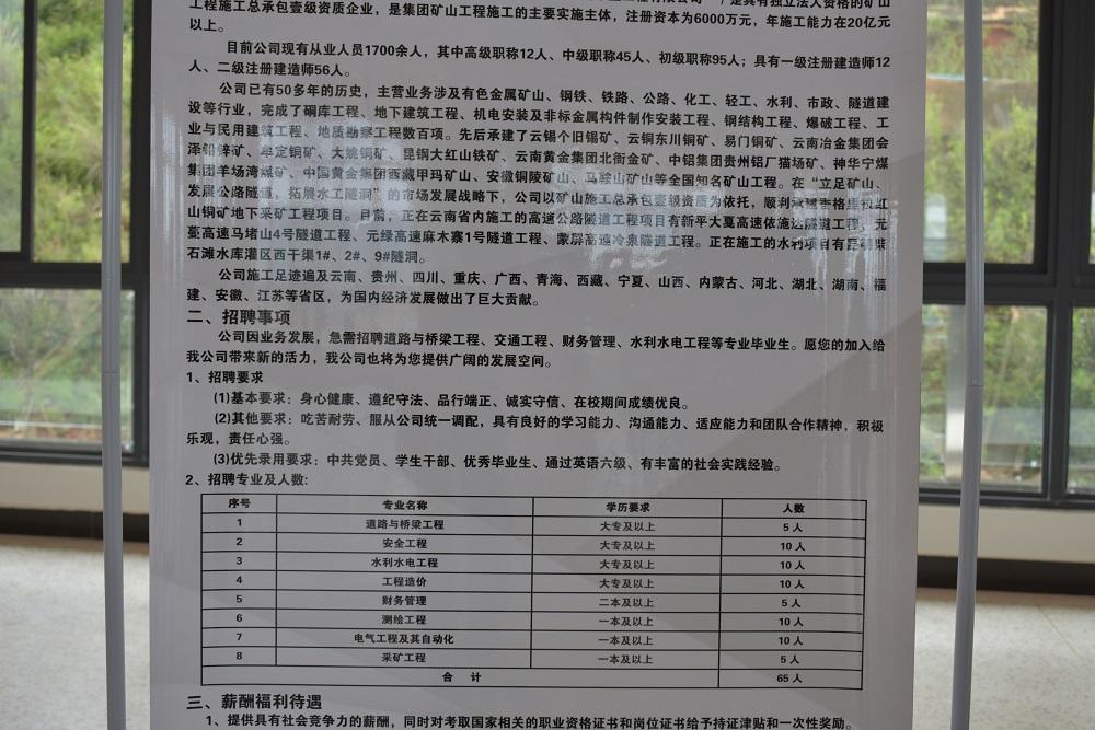 9月12日中午,公司在载物楼二楼大厅举办专场招聘会。云南建投矿业工程有限公司、云南耀荣电力有限公司这两家企业公司到公司招聘面试,此次招聘会涉及的专业有道路与桥梁工程、安全工程、水利水电工程、工程造价、财务管理、测绘工程、电气工程及其自动化、采矿工程等,17级百余名同学积极到场参加面试。
