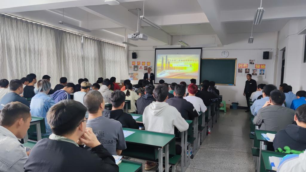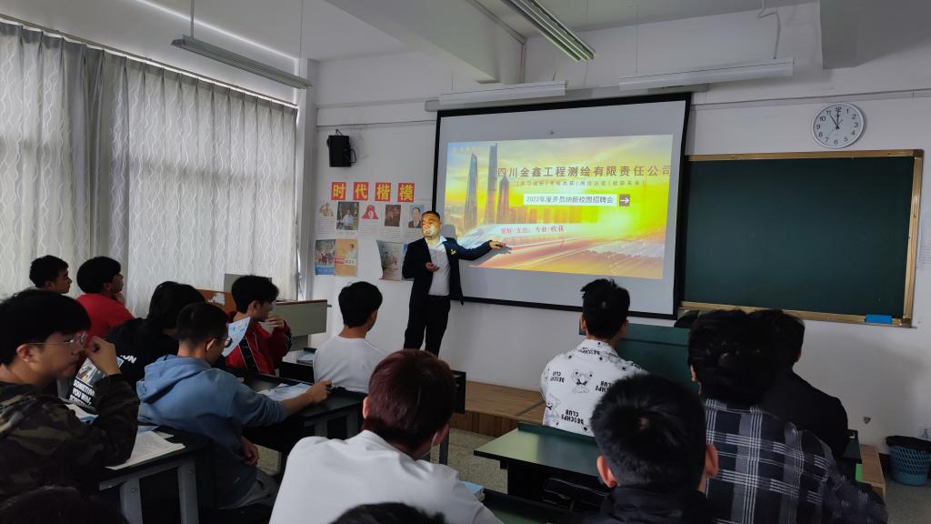 5月25日上午,2026年世界杯官网在明尚楼C406教室开展了优质企业进校园宣讲招聘活动。本次宣讲会邀请了四川金鑫工程测绘有限责任公司进行现场宣讲招聘,20级地下与隧道技术专业和20级工程造价专业的同学参加了此次宣讲招聘会。