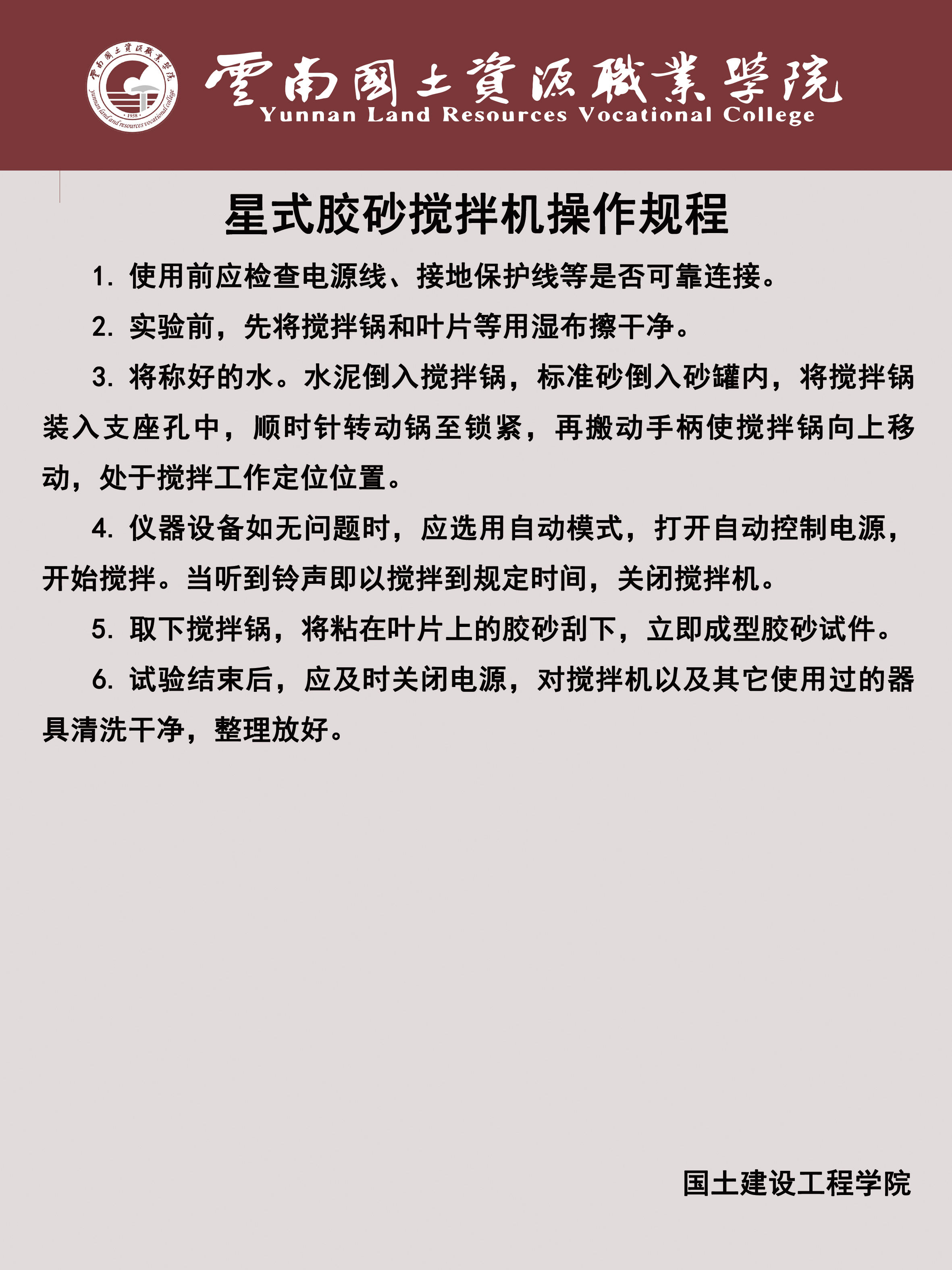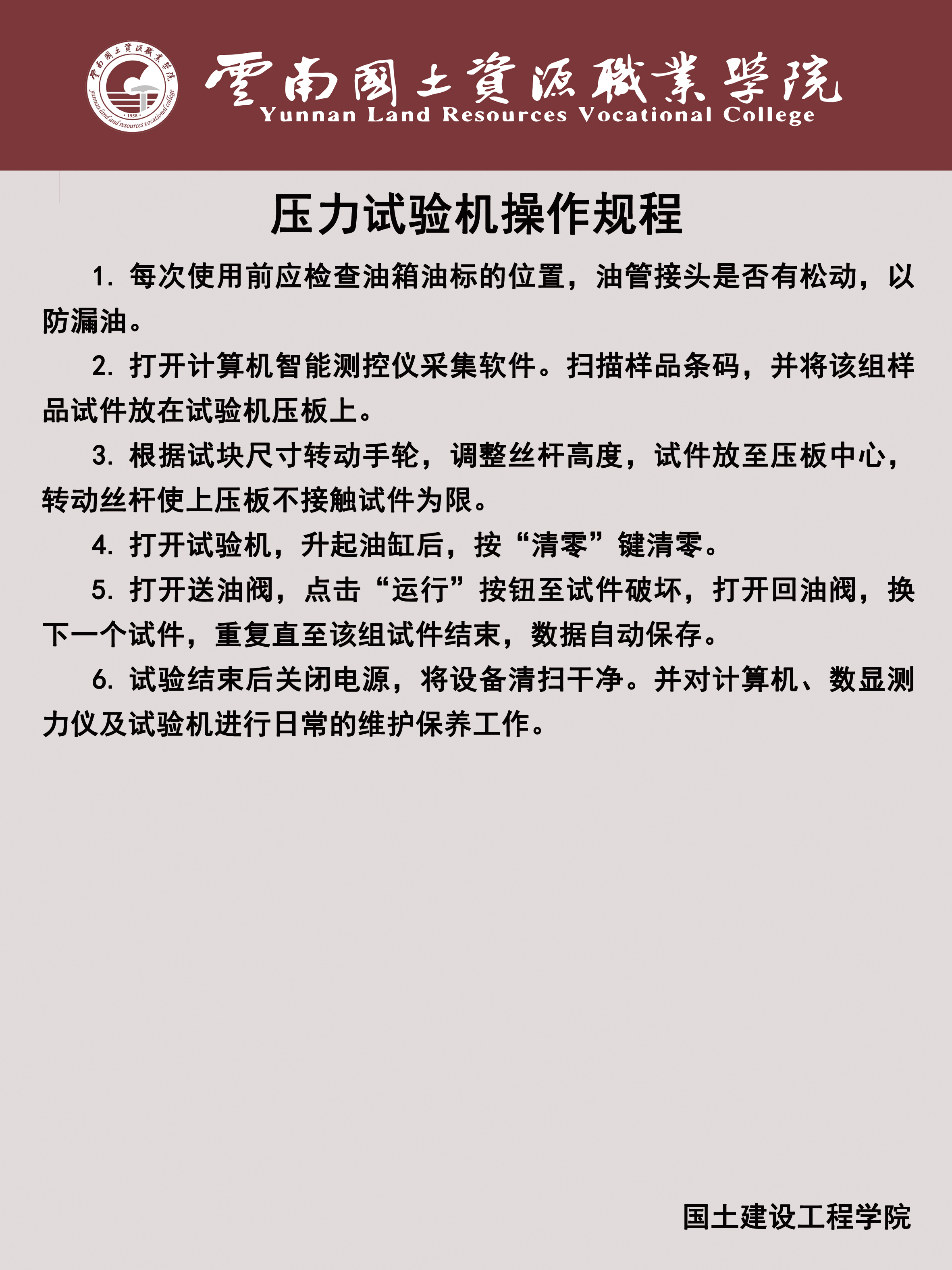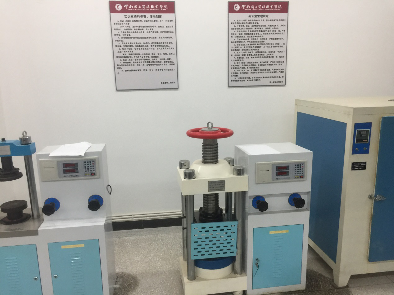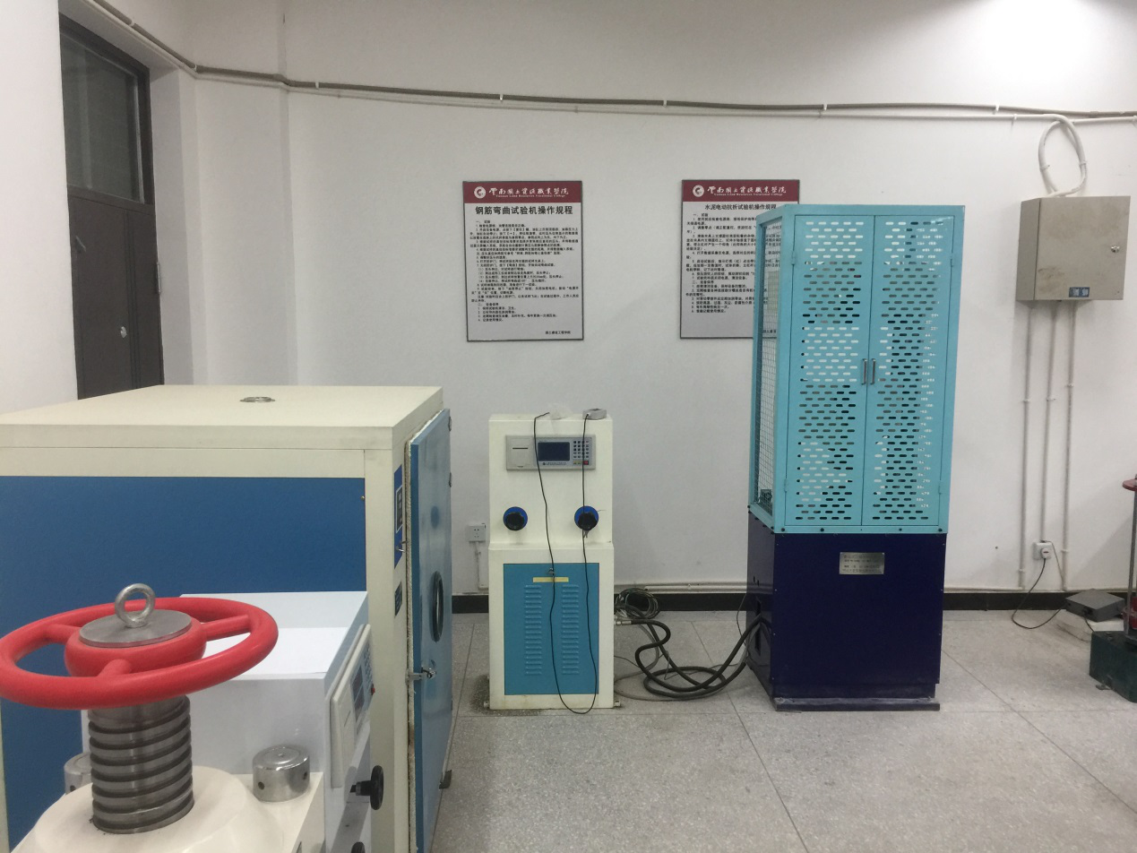 7、工程材料实验室(勘物楼B区111):现有专业设备压力试验机、星式胶砂搅拌机、微机控制油混合压力试验机、水泥净浆标准稠度与凝结时间测定仪、水泥电动抗折试验机、钢筋弯曲试验机、气相色谱仪等17台(套),可容纳30名同学。